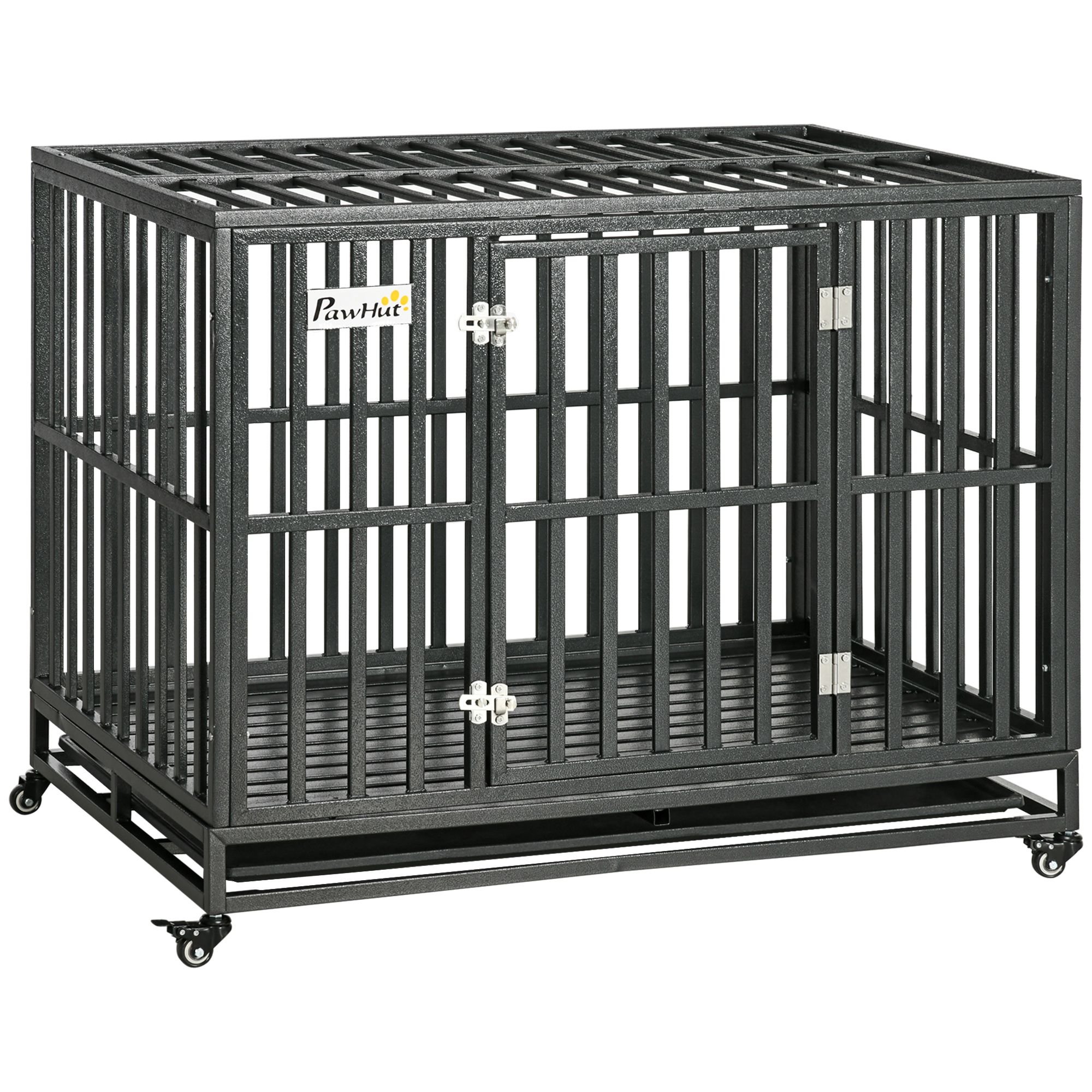 This heavy-duty dog kennel from PawHut provides a comfortable and secure home for your furry friend. Constructed with steel gauge tubes and frames, each bar is securely welded to the frame for long-lasting strength. The bottom slats of this dog kennel are designed for comfort against the pup's paws, while the 4 rolling caster wheels offer easy transportation and movement. This dog crate is the perfect tool for keeping your pets secure while you are away.